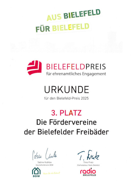 Am 27. Oktober 2025 haben Radio Bielefeld und die BGW den Bielefeld-Preis für ehrenamtliches Engagement vergeben: Wir, d.h. die Fördervereine der Bielefelder Freibäder, haben den 3. Platz erreicht!