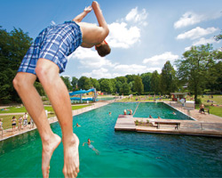 Kristallklar bis zum Grund und prickelnd frisch wie ein See, so präsentiert sich das Brackweder Freibad nach seinem Umbau. Gespeist durch Wasser in seiner natürlichen Form, dem Quellwasser der Ems-Lutter. Gereinigt durch mineralische Bodenfilter, bepflanzt mit einheimischen Wasserpflanzen. Kein Tropfen Chlor ist im Spiel – nur die Natur selbst sorgt für Wasserqualität erster Klasse.
